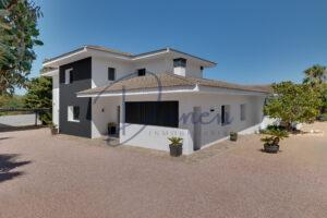 La vivienda principal ofrece espacios amplios y funcionales, con dos salones, seis dormitorios, cuatro baños, cocina totalmente equipada, lavandería y garaje. La casa de invitados, perfecta para recibir visitas o como espacio adicional, dispone de cocina independiente, un salón con grandes ventanales panorámicos, gimnasio y un baño completo.