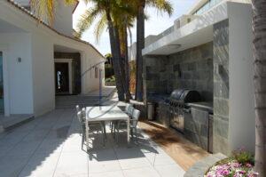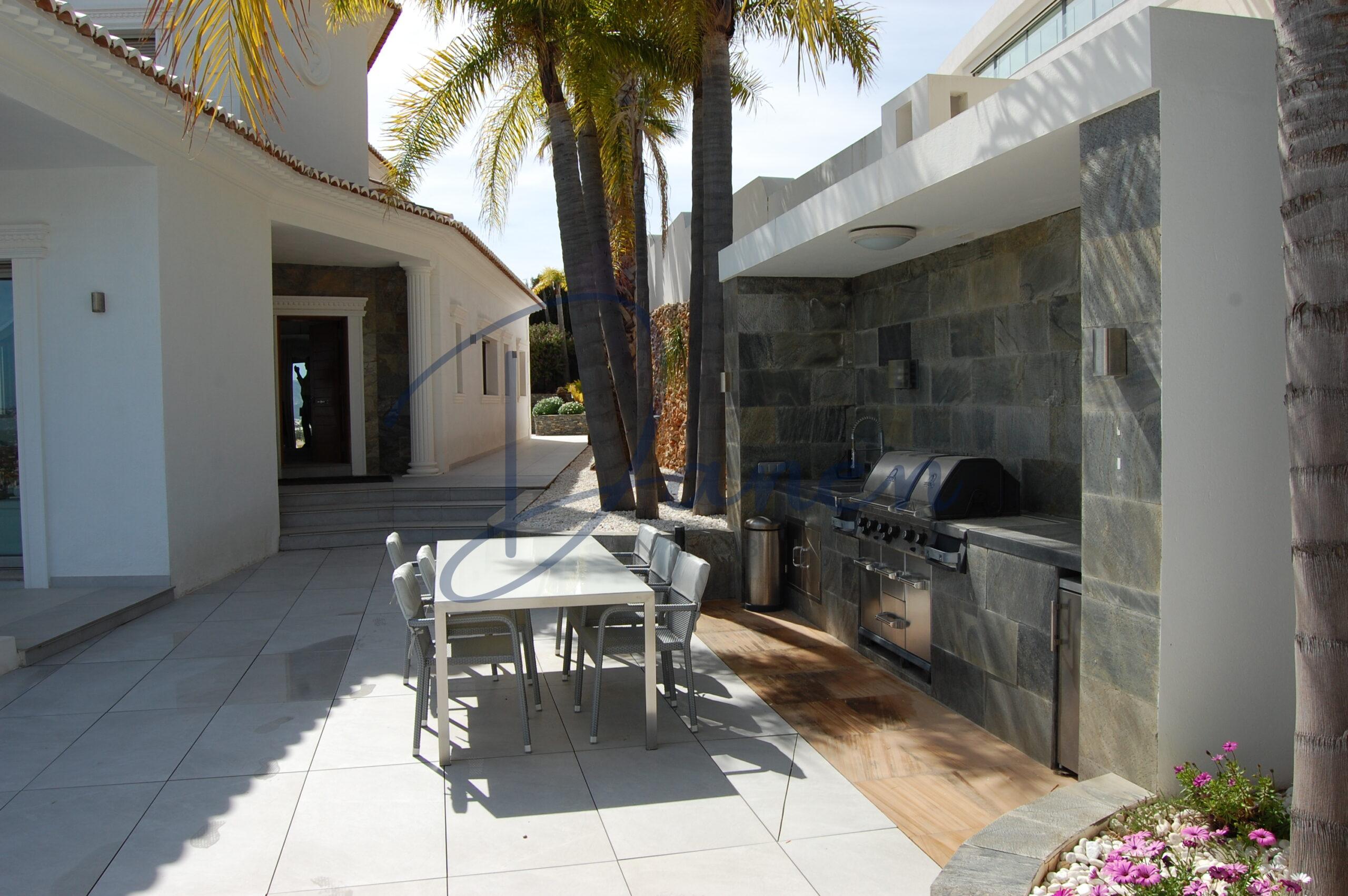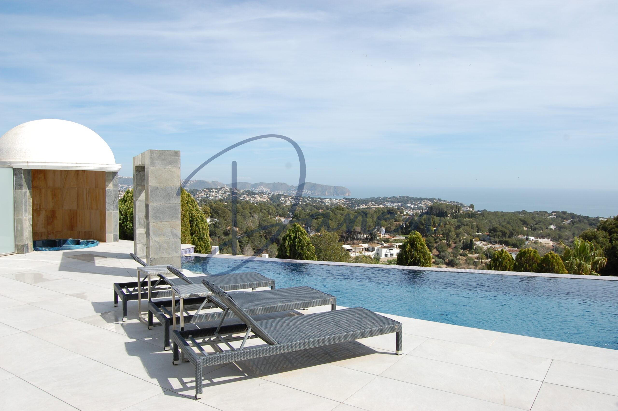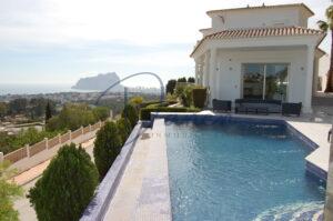 El exterior de la villa está pensado para disfrutar del clima mediterráneo durante todo el año, con amplia terraza, piscina privada, jacuzzi y zona de descanso, todo ello acompañado de impresionantes vistas panorámicas al mar y al Peñón de Ifach.